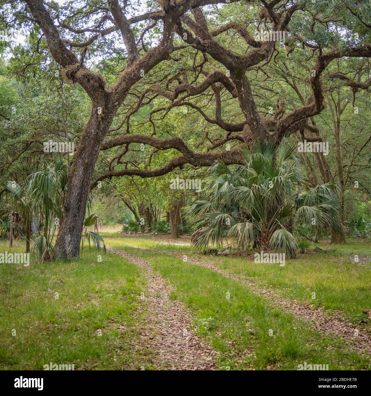 Road Through Forest Area Of Halpata Tastanaki Preserve Path Under Southern Live Oak Trees By Palm Tree Dunnellon Florida Marion County Stock Photo Alamy
